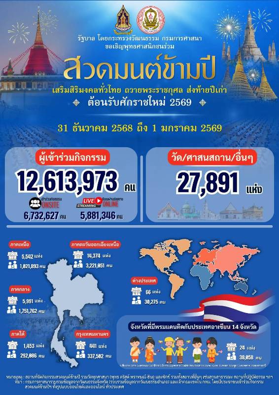 โดยส่วนกลางจัดกิจกรรม ในวันที่ 31ธันวาคม 2568 ณ วัดสระเกศ วัดอรุณราชวราราม และวัดพระเชตุพนวิมลมังคลาราม กรุงเทพมหานคร ซึ่งได้มีการถ่ายทอดสัญญาณภาพงานสวดมนต์ข้ามปี เชื่อมโยงการจัดกิจกรรมสวดมนต์ข้ามปีในส่วนกลางและส่วนภูมิภาคของประเทศไทยและวัดไทยในต่างประเทศ ผ่านทางสถานีวิทยุโทรทัศน์และช่องทางอื่น ๆ โดยกรมการศาสนายังได้จัดทำหนังสือสวดมนต์เพื่อแจกจ่ายให้กับประชาชนที่มาร่วมพิธี และสำหรับในช่วงเช้าของวันที่ 1 มกราคม 2569 จะจัดพิธีตักบาตรรับปีใหม่ ของพุทธศาสนิกชน เพื่อความเป็นสิริมงคลพร้อมกันทั่วประเทศ ในส่วนภูมิภาค 76 จังหวัดองค์กรเครือข่ายทางพระพุทธศาสนาในแต่ละจังหวัด ทั้งภาครัฐ ภาคเอกชน ชุมชนท้องถิ่น ได้ร่วมสนับสนุนการจัดกิจกรรม ตลอดจนเผยแพร่ประชาสัมพันธ์การจัดกิจกรรมสวดมนต์ข้ามปีและกิจกรรมตักบาตรรับปีใหม่ สำหรับการจัดกิจกรรมสวดมนต์ข้ามปีอาเซียน ร่วมกับสำนักงานวัฒนธรรมจังหวัดที่มีพรมแดนติดต่อกับประเทศเพื่อนบ้านในภูมิภาคอาเซียน 14 จังหวัด ได้แก่ 1) เชียงราย 2) ตาก 3) นครพนม 4) นราธิวาส 5) บึงกาฬ 6) มุกดาหาร 7)แม่ฮ่องสอน 8) ยะลา 9) ระนอง 10) เลย 11)สงขลา 12) สตูล 13) หนองคาย 14)อุบลราชธานี และกรมการศาสนายังร่วมกับมหาวิทยาลัยมหาจุฬาลงกรณราชวิทยาลัย ประสานความร่วมมือไปยังวัดไทยและวัดทางพระพุทธศาสนาในต่างประเทศทั่วโลก มากกว่า 25 ประเทศ ร่วมจัดกิจกรรมสวดมนต์ข้ามปี อาทิ อินเดีย เกาหลีใต้ สิงคโปร์ ฝรั่งเศส สหรัฐเอมริกา เยอรมณี เนเธอแลนด์ มาเลเซีย นิวซีแลนด์ ญี่ปุ่น เนปาล นอร์เวย์ อังกฤษ เดนมาร์ค กรีซ ฮังการี แคนาดา เบลเยียม ฮ่องกง ออสเตรีย จีนเป็นต้น โดยกิจกรรมสวดมนต์ข้ามปีในวันที่ 31 ธันวาคม 2568 ที่ผ่านมา กรมการศาสนาได้ร่วมกับสำนักงานสถิติแห่งชาติ และสำนักงานวัฒนธรรมจังหวัดรวบรวมข้อมูลจากศูนย์ประสานงานสวดมนต์ข้ามปี ในกรุงเทพและส่วนภูมิภาค พบว่ามีวัด ศาสนสถานของศาสนาคริสต์ พราหมณ์-ฮินดู และซิกข์ รวมทั้งสถานที่อื่นๆ จัดกิจกรรม โดยในปีนี้ 2569 มีผู้เข้าร่วมกิจกรรมทั้งสิ้น จำนวน 12,613,973 คน (onsite 6,732,627 คน และ online 5,881,346 ครั้ง) เพิ่มขึ้นจากปีที่ผ่านมา 93,761 คน คิดเป็นร้อยละ 0.75 สถิติที่เพิ่มขึ้นอย่างต่อเนื่อง สะท้อนให้เห็นถึงประชาชนให้ความสำคัญการร่วมอนุรักษ์ สืบทอดพระพุทธศาสนา และประเพณีอันดีงามของท้องถิ่นที่มีคุณค่า ให้ดำรงอยู่ในทุกพื้นที่ด้วยความรัก ความสามัคคี และความมีศรัทธาในพระพุทธศาสนา ทั้งนี้ กิจกรรมสวดมนต์ข้ามปีได้ดำเนินการมาอย่างต่อเนื่อง ตั้งแต่ปี พ.ศ. 2548 จวบจนถึงปัจจุบัน และได้รับความสนใจจากประชาชนที่เข้าร่วมกิจกร