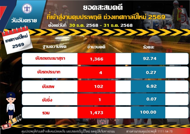 ขณะที่ยอดคดีสะสมตลอด 2 วัน (30-31 ธันวาคม 2568) รวมทั้งสิ้น 1,473 คดี แบ่งเป็น