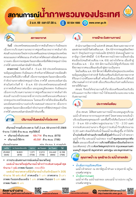 5. ประกาศแจ้งเตือน : ด้วย สทนช. ได้ติดตามสถานการณ์น้ำทะเลหนุนสูงบริเวณแม่น้ำเจ้าพระยาจากกรมอุทกศาสตร์ โดยคาดหมายระดับน้ำบริเวณป้อมพระจุลจอมเกล้า และพื้นที่ใกล้เคียงในระหว่างวันที่ 2 – 9 ม.ค. 69 อาจมีความสูงประมาณ 1.70 – 2.00 เมตร จากระดับทะเลปานกลาง ซึ่งสูงกว่าระดับน้ำวิกฤติประมาณ 0.30 เมตร ส่งผลให้ระดับน้ำในแม่น้ำจะเพิ่มสูงขึ้น ทำให้เกิดน้ำเอ่อล้นเข้าท่วมบริเวณพื้นที่ลุ่มต่ำริมแม่น้ำเจ้าพระยา แม่น้ำท่าจีน และแม่น้ำแม่กลอง รวมถึงชุมชนนอกแนวคันกั้นน้ำ และแนวเขื่อนชั่วคราวบริเวณที่ไม่มีแนวป้องกันน้ำถาวร (แนวฟันหลอ) บริเวณจังหวัดสมุทรปราการ กรุงเทพมหานคร นนทบุรี ปทุมธานี สมุทรสาคร นครปฐม และสมุทรสงคราม