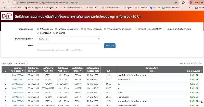 ทั้งนี้ จากฐานข้อมูลระบบแจ้งเตือนสิทธิบัตรการออกแบบผลิตภัณฑ์ที่หมดอายุและใกล้หมดอายุความคุ้มครอง มีสิทธิบัตรการออกแบบฯ ที่หมดอายุความคุ้มครองแล้วทั้งสิ้น 21,988 ฉบับ และสิทธิบัตรการออกแบบฯ ที่กำลังจะหมดอายุความคุ้มครองในช่วง 1-5 ปีข้างหน้า มากกว่า 136,000 ฉบับ ครอบคลุม 7 กลุ่มสาขาสำคัญที่กำลังมาแรงในยุคปัจจุบัน ได้แก่ (1) แฟชันและเครื่องแต่งกาย (2) อาหารและบรรจุภัณฑ์ (3) การแพทย์ สุขภาพ และความงาม (4) วัสดุก่อสร้างและเครื่องใช้ไฟฟ้า (5) ยานยนต์และชิ้นส่วนยานยนต์ (6) อิเล็กทรอนิกส์ และ (7) นันทนาการ โดยเชื่อมั่นว่าข้อมูลเชิงลึกเหล่านี้จะสามารถจุดประกายไอเดียสร้างสรรค์ใหม่ๆ ให้กับอุตสาหกรรมออกแบบของไทยได้อีกมาก