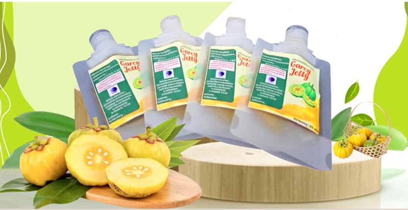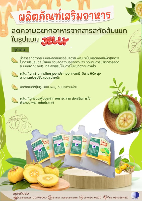 2) ผลิตภัณฑ์ผ่านการศึกษาองค์ประกอบทางเคมี โดยพบว่ามีสาร HCA สูง ฤทธิ์ทางเภสัชวิทยาและกลไกการออกฤทธิ์ พบว่า สามารถช่วยปรับสมดุลน้ำหนัก โดยกระตุ้นการทำงานของสารสื่อประสาท serotonin และส่งผลต่อการสร้างฮอร์โมน ghrelin ซึ่งเป็นฮอร์โมนความหิวลดลง จึงช่วยควบคุมน้ำหนักได้ โดยการลดความอยากอาหารผ่านกลไกการกระตุ้นการทำงานของสารสื่อประสาท และทำให้ความหิวลดลง นอกจากนี้ยังผ่านการทดสอบประเมินความปลอดภัยทั้งในระดับเซลล์และสัตว์ทดลอง ขณะนี้อยู่ระหว่างการศึกษาขั้นคลินิก (phase 1-2) ในอาสาสมัคร โดยผลิตภัณฑ์ถูกพัฒนาขึ้นในรูปแบบ Jelly ที่รับประทานง่าย จึงช่วยเพิ่มมูลค่าทางการตลาด และส่งเสริมการใช้พืชสมุนไพรภายในประเทศ