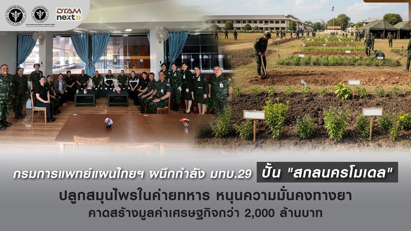 กรมการแพทย์แผนไทยและการแพทย์ทางเลือก ร่วมมือกับ มณฑลทหารบกที่ 29 (มทบ.29) จ.สกลนคร บูรณาการพื้นที่ หน่วยทหารปลูกสมุนไพรเกรดทางการแพทย์ (Medical Grade) นำร่อง มทบ.29 สกลนคร ชูระบบ”เกษตรพันธสัญญา” เชื่อมโยงต้นน้ำสู่ปลายน้ำ ผลักดันโรงงาน “อาจาโร เฮิร์บ” สู่มาตรฐานโลก เล็งสร้างมูลค่าเศรษฐกิจยาสมุนไพรในระบบสุขภาพ กว่า 2,000 ล้านบาท