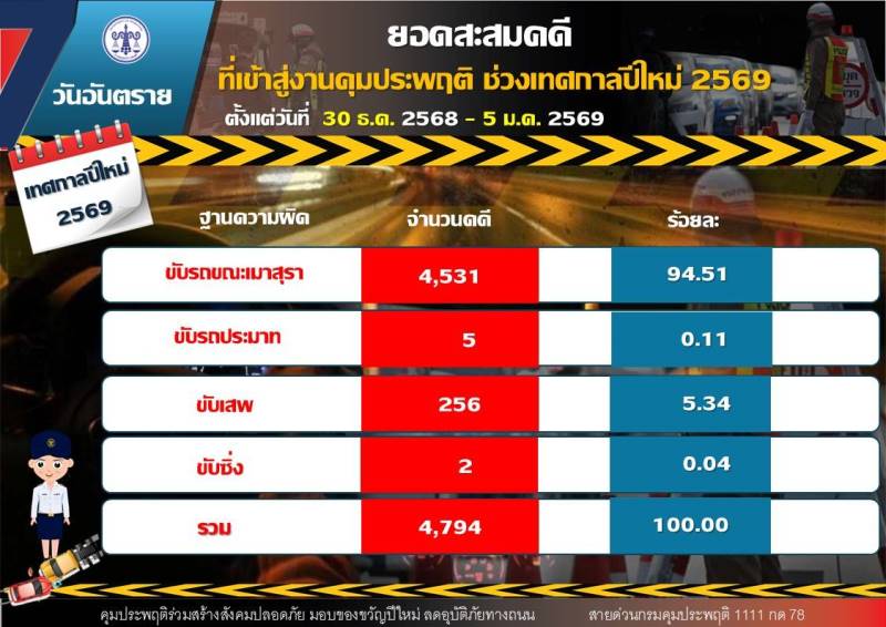 ขณะที่ยอดคดีสะสมตลอด 7 วัน ตั้งแต่วันที่ 30 ธันวาคม 2568 – 5 มกราคม 2569 รวมทั้งสิ้น 4,794 คดี แบ่งเป็น