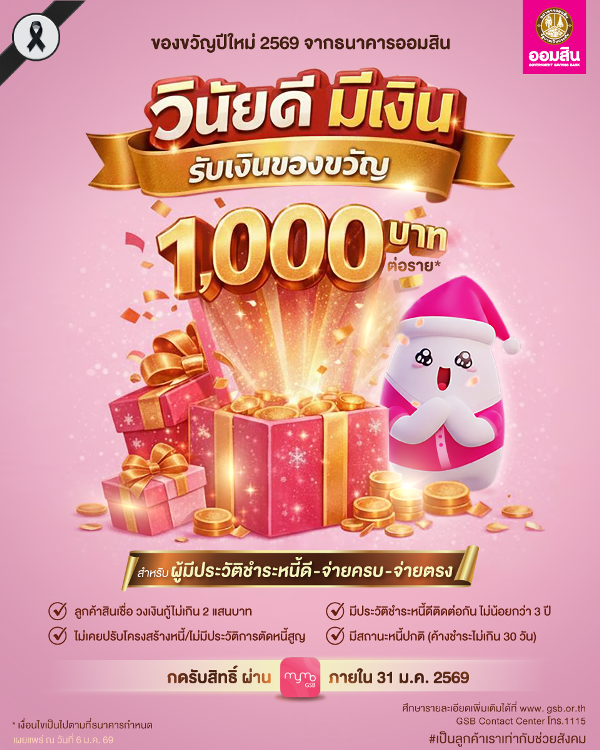 ธนาคารออมสิน ร่วมส่งมอบความสุขในช่วงเทศกาลต้อนรับปีใหม่ 2569 จัดเตรียมของขวัญ เพื่อส่งความสุขให้ประชาชน ภายใต้โครงการ “วินัยดี มีเงิน” ให้แก่ลูกค้าธนาคารด้วยการมอบเงินของขวัญพิเศษรายละ 1,000 บาท ให้แก่ลูกหนี้ที่ใช้บริการสินเชื่อวงเงินกู้ไม่เกิน 200,000 บาท มีประวัติชำระหนี้ดีติดต่อกันไม่น้อยกว่า 3 ปี ไม่เคยปรับโครงสร้างหนี้/ไม่มีประวัติการตัดหนี้สูญ และมีสถานะหนี้ปกติ (ค้างชำระไม่เกิน 30 วัน) ทั้งนี้ ธนาคารจะโอนเงินเข้าบัญชีภายในเดือนกุมภาพันธ์ 2569 เฉพาะผู้ที่มีบัญชีเงินฝากเผื่อเรียกที่เป็นชื่อตนเอง (ยกเว้นบัญชีเพื่อประโยชน์ของผู้เยาว์ และบัญชีร่วม) ที่กดรับสิทธิ์ผ่านแอปพลิเคชัน MyMo ภายในวันที่ 31 มกราคม 2569 และเงื่อนไขเป็นไปตามที่ธนาคารกำหนด เพื่อมอบเป็นขวัญและกำลังใจแก่ลูกค้าที่มีวินัยในการผ่อนชำระหนี้ที่ดี นำไปใช้เป็นเงินทุนเสริมสภาพคล่องในการประกอบอาชีพ หรือใช้จ่ายในช่วงเทศกาลปีใหม่