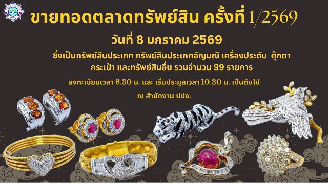 สำนักงาน ปปง. จะทำการขายทอดตลาดทรัพย์สินโดยวิธีการประมูลปากเปล่า ครั้งที่ 1/2569 ซึ่งเป็นทรัพย์สินประเประเภทประเภทอัญมณี เครื่องประดับ ตุ๊กตา กระเป๋า และทรัพย์สินอื่น จำนวน 99 รายการ โดยจะทำการขายทอดตลาดทรัพย์สินในวันที่ 8 มกราคม 2569 ลงทะเบียนตั้งแต่เวลา 08.30 น. เริ่มประมูลเวลา 10.30 น. เป็นต้นไป ณ บริเวณชั้น 1 อาคารสำนักงาน ปปง. โดยมีรายการทรัพย์สิน