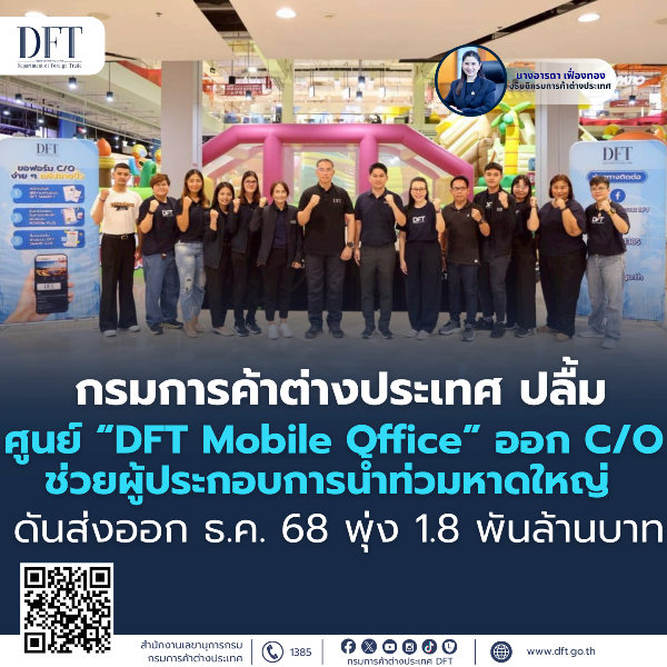นางอารดา เฟื่องทอง อธิบดีกรมการค้าต่างประเทศ เปิดเผยว่า ตลอดเดือนธันวาคม 2568 ที่ผ่านมา กรมฯ ได้รับความร่วมมือจากศูนย์การค้าเซ็นทรัลหาดใหญ่ให้ใช้พื้นที่บริเวณชั้น 3 จัดตั้งศูนย์ “DFT Mobile Office” เพื่อให้บริการออกหนังสือรับรองถิ่นกำเนิดสินค้า (C/O) แก่ผู้ประกอบการในพื้นที่โดยไม่คิดค่าแบบพิมพ์ เนื่องจากสำนักงานพาณิชย์จังหวัดสงขลา (สาขาหาดใหญ่) ได้รับผลกระทบจากน้ำท่วมเช่นกัน ทำให้ไม่สามารถเปิดให้บริการออก C/O ได้ตามปกติ