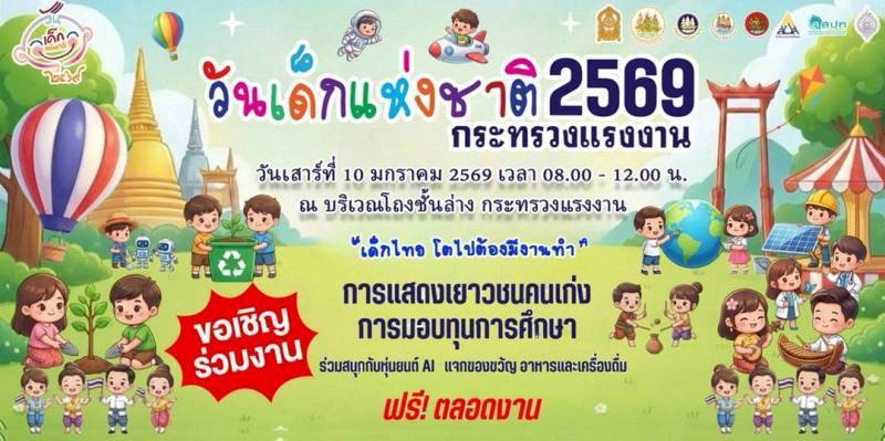ก.แรงงาน เปิดบ้าน ! ต้อนรับวันเด็ก 2569 ชวน “เด็กไทย โตไปต้องมีงานทำ” พบกับกิจกรรมสนุก – เรียนรู้ สัมผัสโลกอาชีพ หุ่นยนต์ AI และรางวัลมากมาย แล้วพบกันเสาร์ที่ 10 ม.ค.นี้ ที่กระทรวงแรงงาน