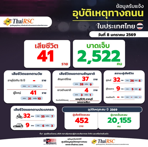 สถานการณ์อุบัติเหตุทางถนนในประเทศไทย วันที่ 8 ม.ค. 69