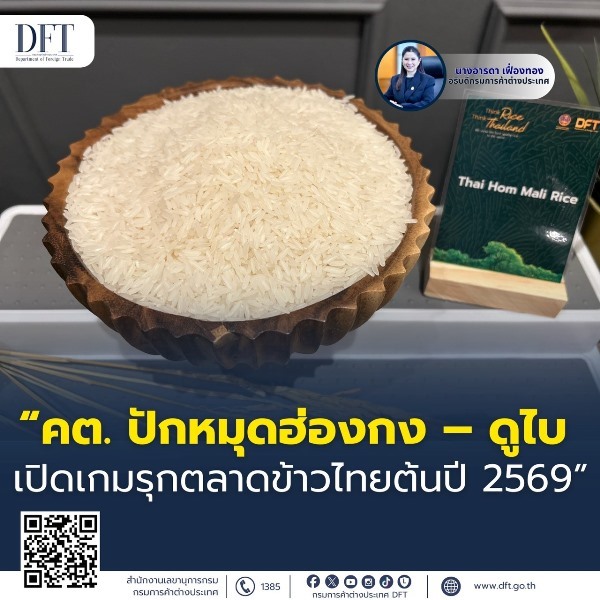 1. การนำคณะผู้แทนการค้าภาครัฐและเอกชนไทยเดินทางเยือนเขตบริหารพิเศษฮ่องกง สาธารณรัฐประชาชนจีน ระหว่างวันที่ 18 – 20 มกราคม 2569 โดยมีกำหนดเข้าพบอธิบดีกรมการค้าและอุตสาหกรรมของฮ่องกง (Hong Kong Trade and Industry Department: TID) ซึ่งเป็นหน่วยงานรัฐที่กำกับดูแลด้านการนำเข้า – ส่งออกสินค้าของฮ่องกงในด้านต่างๆ เช่น การควบคุมคลังสินค้า ถิ่นกำเนิดสินค้า กฎระเบียบทางการค้า และใบอนุญาตส่งออก เป็นต้น รวมทั้งการพบหารือกับสมาคมผู้นำเข้าข้าวฮ่องกง ซึ่งเป็นผู้มีบทบาทสำคัญที่ทำให้ข้าวไทยยังคงครองส่วนแบ่งตลาดข้าวเป็นอันดับ 1 ในฮ่องกงมาโดยตลอด ทั้งนี้ ฮ่องกงเป็นตลาดส่งออกที่สำคัญของข้าวไทยมาอย่างยาวนาน โดยแต่ละปีไทยส่งออกข้าวไปฮ่องกงประมาณ 157,000 – 174,000 ตัน ขณะที่ฮ่องกงนำเข้าข้าวจากต่างประเทศประมาณ 275,000 – 307,000 ตัน/ปี ไทยครองส่วนแบ่งตลาดข้าวนำเข้าข้าวของฮ่องกงประมาณร้อยละ 60 โดยเป็นอันดับ 1 มาโดยตลอด ข้าวไทยที่ส่งออกไปฮ่องกงส่วนใหญ่ร้อยละ 80 เป็นข้าวหอมมะลิไทย (ฮ่องกงติด 1 ใน 3 ตลาดส่งออกข้าวหอมมะลิไทยมาโดยตลอด) ที่เหลือเป็นข้าวหอมไทย ข้าวขาว และข้าวเหนียว