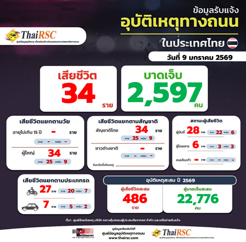 สถานการณ์อุบัติเหตุทางถนนในประเทศไทย วันที่ 9 ม.ค. 69 10 มกราคม 2026Thailandplusประชาสัมพันธ์ Facebook iconFacebookTwitter iconTwitterLINE iconLineสถานการณ์อุบัติเหตุทางถนนในประเทศไทย วันที่ 9 ม.ค. 69