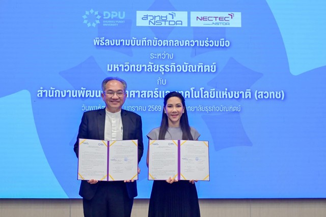 มหาวิทยาลัยธุรกิจบัณฑิตย์ (DPU) ลงนามความร่วมมือ สำนักงานพัฒนาวิทยาศาสตร์และเทคโนโลยีแห่งชาติ (สวทช.)  เดินหน้าโครงการด้านการวิจัยและพัฒนา ขับเคลื่อน Embedded AI  หรือ “AI เพื่อการศึกษา” ยกระดับการเรียนการสอนยุคใหม่ พัฒนาศักยภาพและสร้างกำลังคนดิจิทัล ตามนโยบาย อว. for AI  ของกระทรวงการอุดมศึกษา วิทยาศาสตร์ วิจัยและนวัตกรรม