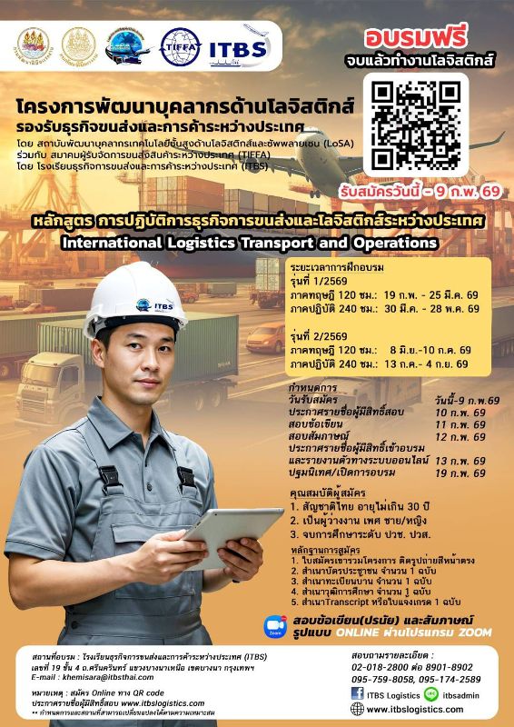 กรมพัฒนาฝีมือแรงงาน โดยสถาบันพัฒนาบุคลากรเทคโนโลยีชั้นสูงด้านโลจิสติกส์และซัพพลายเชน (LoSA) ร่วมกับ สมาคมผู้รับจัดการขนส่งสินค้าระหว่างประเทศ (TIFFA) โดย โรงเรียนธุรกิจการขนส่งและการค้าระหว่างประเทศ (ITBS) เปิดรับสมัครฝึกอบรม หลักสูตร การปฏิบัติการธุรกิจการขนส่งและโลจิสติกส์ระหว่างประเทศ สำหรับวุฒิ ปวช. และ ปวส. ตั้งแต่บัดนี้ ถึง 9 กุมภาพันธ์ 2569 เท่านั้น