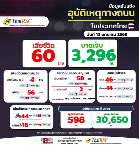 สถานการณ์อุบัติเหตุทางถนนในประเทศไทย วันที่ 12 ม.ค. 69 13 มกราคม 202614 มกราคม 2026Thailandplusประชาสัมพันธ์ Facebook iconFacebookTwitter iconTwitterLINE iconLineสถานการณ์อุบัติเหตุทางถนนในประเทศไทย วันที่ 12 ม.ค. 69