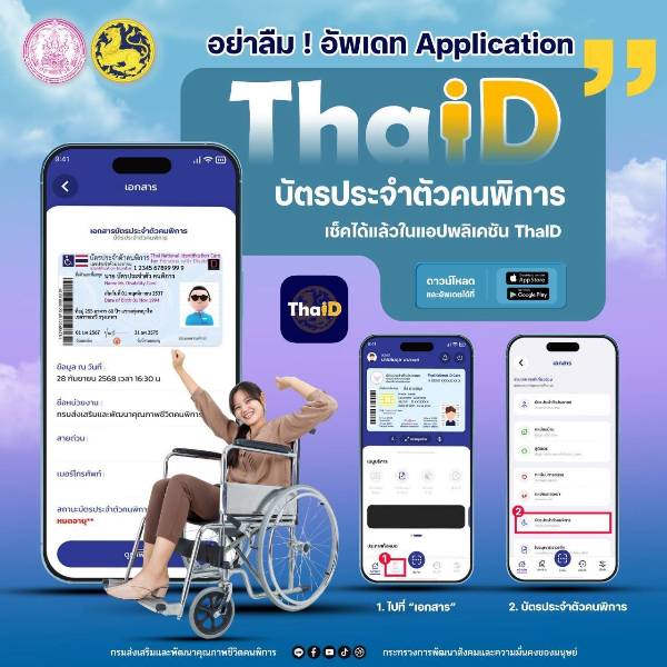สำหรับขั้นตอนการตรวจสอบบัตรประจำตัวคนพิการดิจิทัล สามารถปฏิบัติตามขั้นตอนดังต่อไปนี้ 1) เปิดแอปพลิเคชัน “ThaID” 2) กดไปที่ “เอกสาร” (แถบด้านล่าง) และ 3) เลือกหัวข้อ “บัตรประจำตัวคนพิการ“ ซึ่งจะแสดงข้อมูลเอกสารบัตรประจำตัวคนพิการ หากไม่มีตัวเลือก “บัตรประจำตัวคนพิการ” หรือข้อมูลไม่ขึ้น จำเป็นต้องอัพเดทแอปพลิเคชัน “ThaID” และทำรายการใหม่อีกครั้ง โดยสามารถอัพเดทผ่านทาง App Store : https://bit.ly/3MjGJYV สำหรับผู้ใช้อุปกรณ์ระบบปฏิบัติการ iOS และผ่านทาง Play Store : https://bit.ly/3BmYi3H สำหรับผู้ใช้อุปกรณ์ระบบปฎิบัติการ Android