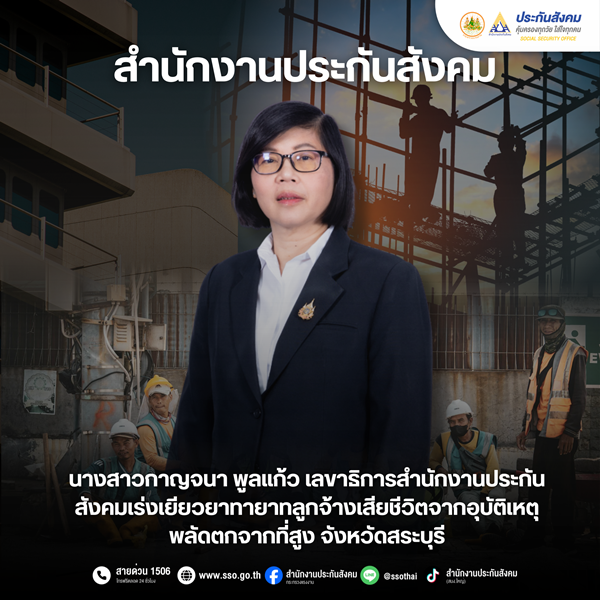 เมื่อวันที่ 10 มกราคม 2569 เวลาประมาณ 10.30 เกิดอุบัติเหตุลูกจ้างเสียชีวิต 1 ราย จากการพลัดตกที่สูงขณะปฏิบัติงาน ในพื้นที่จังหวัดสระบุรี นางสาวกาญจนา พูลแก้ว เลขาธิการสำนักงานประกันสังคม ได้แสดงความเสียใจต่อเหตุการณ์ที่เกิดขึ้น พร้อมมอบหมายให้ นายภัทรพล ตันเสถียร ประกันสังคมจังหวัดสระบุรี เร่งดำเนินการตรวจสอบสิทธิประโยชน์ตามกฎหมายโดยทันที