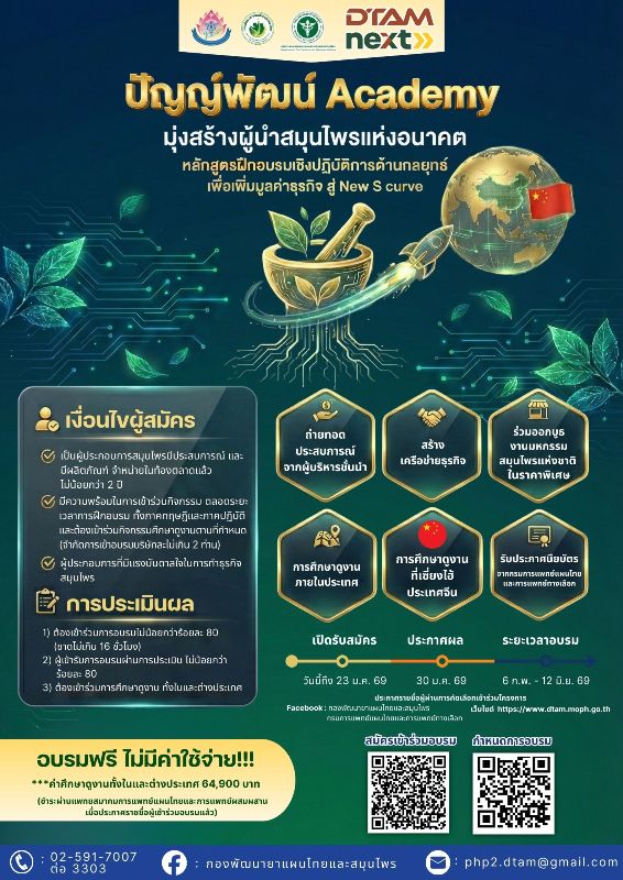 กรมการแพทย์แผนไทยและการแพทย์ทางเลือก เดินหน้ายกระดับอุตสาหกรรมสมุนไพรไทย เปิดรับสมัครผู้ประกอบการผลิตภัณฑ์สมุนไพรเข้าร่วมโครงการ “ปัญญ์พัฒน์ Academy” หลักสูตรฝึกอบรมเชิงปฏิบัติการด้านกลยุทธ์เพื่อเพิ่มมูลค่าธุรกิจสู่ New S-Curve มุ่งสร้างผู้นำธุรกิจผลิตภัณฑ์สมุนไพรไทยยุคใหม่ด้วยนวัตกรรม พร้อมสร้างเครือข่ายธุรกิจระดับสากล เปิดรับสมัครตั้งแต่วันนี้ ถึง 23 มกราคม 2569 อบรม ฟรี! ตลอดหลักสูตร (ยกเว้นค่าศึกษาดูงานทั้งในและต่างประเทศ) สมัครได้ทางเว็บไซต์ https://www.dtam.moph.go.th