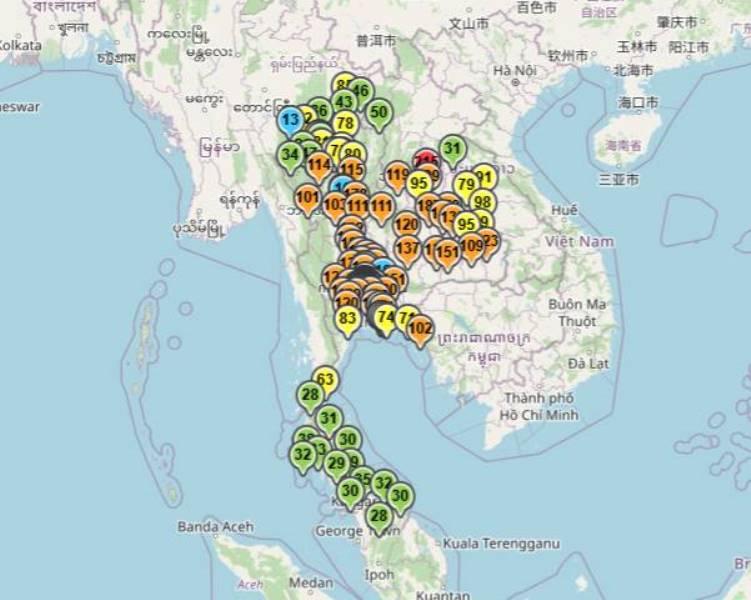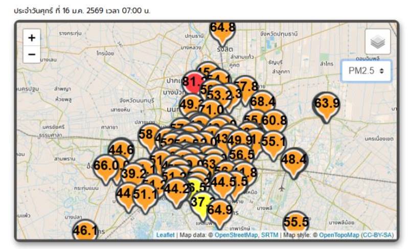 ศูนย์สื่อสารการแก้ไขมลพิษทางอากาศ (ศกพ.) กรมควบคุมมลพิษ รายงานสถานการณ์ฝุ่นละออง PM 2.5 วันที่ 16 มกราคม 2569 เวลา 07:00 น. พื้นที่ กรุงเทพฯและปริมณฑล (สมุทรสาคร สมุทรปราการ ปทุมธานี นนทบุรี นครปฐม) เริ่มมีแนวโน้มบรรเทาลง ส่วนใหญ่อยู่ในระดับสีส้ม (เริ่มมีผลกระทบต่อสุขภาพ) อยู่ในระดับสีเหลือง (ระดับปานกลาง) 1 สถานี ที่อำเภอเมืองสมุทรปราการ 37.3 ไมโครกรัมต่อลูกบาศก์เมตร และสูงสุดระดับสีแดง (มีผลกระทบต่อสุขภาพ) 1 สถานี ที่อำเภอปากเกร็ดนนทบุรี 81.2 ไมโครกรัมต่อลูกบาศก์เมตร