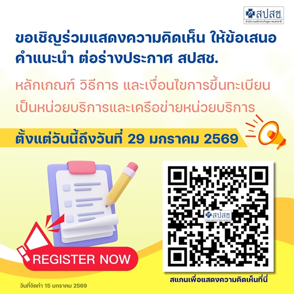 ขอเชิญร่วมแสดงความคิดเห็นต่อร่างประกาศ สปสช. การขึ้นทะเบียนเป็นหน่วยบริการและเครือข่ายหน่วยบริการ ตั้งแต่วันนี้ – 29 ม.ค.69