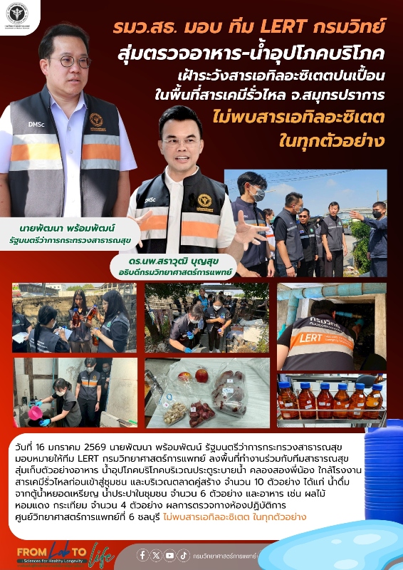 รมว.สธ. มอบทีม LERT กรมวิทยาศาสตร์การแพทย์ สุ่มตรวจอาหาร-น้ำอุปโภคบริโภคเฝ้าระวังสารเอทิลอะซิเตตปนเปื้อนในพื้นที่สารเคมีรั่วไหล จ.สมุทรปราการ ไม่พบสารเอทิลอะซิเตต ในทุกตัวอย่าง