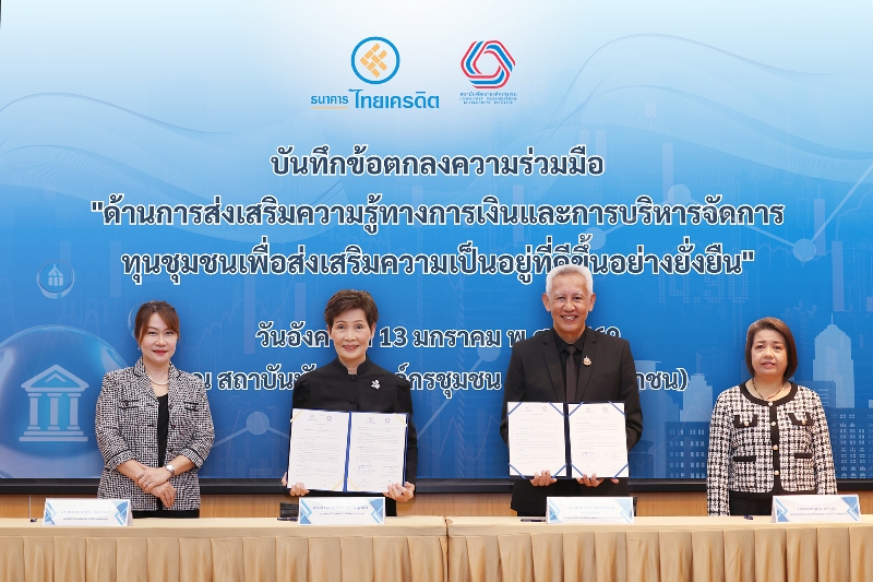 ธนาคารไทยเครดิต จำกัด (มหาชน) เดินหน้าตอกย้ำจุดยืนในการเป็นธนาคารเพื่อสังคมและความยั่งยืน จับมือสถาบันพัฒนาองค์กรชุมชน (องค์การมหาชน) หรือ พอช. (ภายใต้การกำกับดูแลของรัฐมนตรีว่าการกระทรวงการพัฒนาสังคมและความมั่นคงของมนุษย์) ลงนามบันทึกข้อตกลงความร่วมมือ (MOU) “ด้านการส่งเสริมความรู้ทางการเงิน และการบริหารจัดการทุนชุมชน เพื่อส่งเสริมความเป็นอยู่ที่ดีขึ้นอย่างยั่งยืน” โดยมี นายกฤษดา สมประสงค์ ผู้อำนวยการสถาบันพัฒนาองค์กรชุมชน และ นางสาวกฤษณา อร่ามกุลชัย กรรมการ ธนาคารไทยเครดิต จำกัด (มหาชน) ผู้บริหารระดับสูงจากทั้งสององค์กรเข้าร่วมพิธีลงนาม จัดขึ้นเมื่อวันที่ 13 มกราคม 2569 ณ ห้องประชุมไพบูลย์วัฒนศิริธรรม สถาบันพัฒนาองค์กรชุมชน