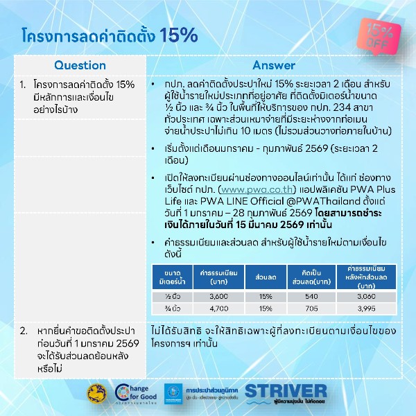 นายจักรพงศ์ คำจันทร์ ผู้ว่าการ กปภ. กล่าวว่าโครงการลดค่าติดตั้งประปาใหม่ 15%ระยะเวลา 2 เดือน (มกราคม-กุมภาพันธ์ 2569) เป็นหนึ่งในของขวัญปีใหม่ 2569 ที่ กปภ. ตั้งใจมอบให้แก่ประชาชน เพื่อช่วยลดภาระค่าใช้จ่ายในครัวเรือน และส่งเสริมให้ประชาชนเข้าถึงน้ำประปาสะอาด ปลอดภัย ได้มาตรฐานอย่างทั่วถึง สำหรับสิทธิประโยชน์นี้ มอบให้แก่ผู้ใช้น้ำรายใหม่ประเภทที่อยู่อาศัยที่ติดตั้งมาตรวัดน้ำขนาด 1/2 นิ้ว และ 3/4 นิ้ว ในพื้นที่ให้บริการของ กปภ. 234 สาขาทั่วประเทศ เฉพาะส่วนเหมาจ่ายที่มีระยะห่างจากท่อเมนจ่ายน้ำประปาไม่เกิน 10 เมตร (ไม่รวมส่วนวางท่อภายในบ้าน) โดยเปิดให้ประชาชนลงทะเบียนผ่านช่องทางออนไลน์เท่านั้น ได้แก่ เว็บไซต์กปภ. www.pwa.co.th แอปพลิเคชัน PWA Plus Life และ PWA LINE Official @PWAThailandตั้งแต่วันที่ 1 มกราคม–28 กุมภาพันธ์ 2569 และสามารถชำระเงินค่าติดตั้งได้ภายในวันที่ 15 มีนาคม 2569 ปัจจุบันมีประชาชนให้ความสนใจและยื่นคำร้องขอติดตั้งประปาใหม่อย่างต่อเนื่องเกือบ 700 ราย ซึ่งเป็นการลดภาระค่าใช้จ่ายให้กับประชาชนได้อีกช่องทางหนึ่ง