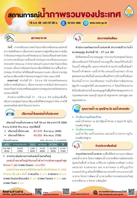สรุปสถานการณ์น้ำภาพรวมของประเทศ วันที่ 19 ม.ค. 69 เวลา 7.00 น.
