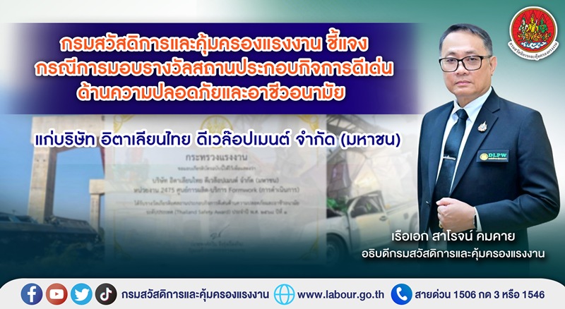 เรือเอก สาโรจน์ คมคาย อธิบดีกรมสวัสดิการและคุ้มครองแรงงาน เปิดเผยว่า จากกรณีที่ปรากฏภาพเกียรติบัตรรางวัลสถานประกอบกิจการดีเด่นด้านความปลอดภัยและอาชีวอนามัย (Thailand Safety Award) ซึ่งกรมสวัสดิการและคุ้มครองแรงงานมอบให้แก่บริษัท อิตาเลียนไทย ดีเวล๊อปเมนต์ จำกัด (มหาชน) และมีการเผยแพร่ผ่านสื่อมวลชนในขณะนี้ กรมสวัสดิการและคุ้มครองแรงงานขอชี้แจงข้อเท็จจริงเพื่อความเข้าใจที่ถูกต้องของสังคม ดังนี้