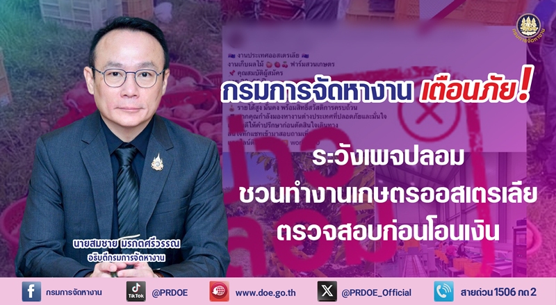 กรมการจัดหางาน เตือนภัยระวังเพจปลอมระบาดหนัก ชวนทำงานเกษตรออสเตรเลีย ย้ำตรวจสอบก่อนโอนเงิน