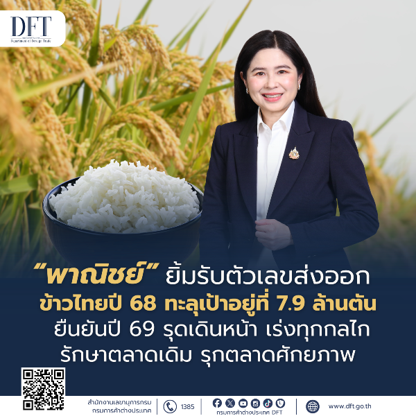 กระทรวงพาณิชย์โดยกรมการค้าต่างประเทศเปิดเผยตัวเลขส่งออกข้าวปี 2568 อยู่ที่ 7.9 ล้านตัน สูงกว่าที่คาดการณ์ที่ 7.5 ล้านตัน จากคำสั่งซื้อช่วงปลายปีของผู้นำเข้าสำคัญที่เร่งนำเข้าข้าวเพื่อรองรับกับเทศกาลคริสต์มาสและปีใหม่ต่อเนื่องไปจนถึงเทศกาลตรุษจีน สำหรับปี 2569 ยืนยันเดินหน้าผลักดันการส่งออกข้าวอย่างเต็มกำลัง พร้อมร่วมมือกับภาคเอกชน มุ่งรักษาตลาดเดิม พร้อมรุกขยายตลาดที่มีศักยภาพ เพื่อรองรับผลผลิตข้าวไทยอย่างต่อเนื่อง