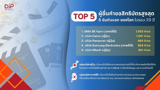 ​ทั้งนี้ เมื่อพิจารณาในมิติของผู้ขับเคลื่อนนวัตกรรมในเวทีระดับโลก พบว่า องค์กรขนาดใหญ่มีการวางแผนด้านสิทธิบัตรอย่างเป็นระบบ และใช้ทรัพย์สินทางปัญญาเป็นเครื่องมือสร้างความได้เปรียบเชิงธุรกิจในระยะยาว โดยผู้ยื่นคำขอสิทธิบัตรสูงสุด 5 อันดับแรกของโลก ได้แก่ บริษัท SK Hynix (เกาหลีใต้) 1,855 คำขอ ทิ้งห่างอันดับ 2 อย่างบริษัท Canon (ญี่ปุ่น) 1,001 คำขอ ตามมาด้วยบริษัท Panasonic (ญี่ปุ่น) 964 คำขอ บริษัท Samsung Electronics (เกาหลีใต้) 954 คำขอ และบริษัท Hitachi (ญี่ปุ่น) 941 คำขอ ซึ่งกลุ่มบริษัทญี่ปุ่นให้ความสำคัญกับการผลิตเทคโนโลยีระบบภาพและอุปกรณ์ที่เกี่ยวกับการผลิตสื่อดิจิทัล โดยเฉพาะเทคโนโลยีการถ่ายภาพ การพิมพ์ การจัดเก็บข้อมูล และระบบอัตโนมัติ ส่วนกลุ่มบริษัทเกาหลีใต้ เน้นเทคโนโลยีระดับฮาร์ดแวร์และระบบประมวลผลที่ขับเคลื่อนทั้งวงการภาพยนตร์ เกม และคอนเทนต์แบบ Immersive ที่ผสมผสานเทคโนโลยีการรับรู้ และการเล่าเรื่องอย่างมีชั้นเชิง เพื่อสร้างประสบการณ์ที่ทำให้ผู้ชมมีส่วนร่วมเสมือนหลุดไปอยู่อีกโลกหนึ่ง