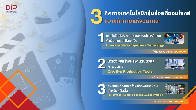 ​อธิบดีกรมทรัพย์สินทางปัญญา กล่าวเพิ่มเติมว่า ปัจจุบันทิศทางเทคโนโลยีกลุ่มย่อยในอุตสาหกรรมภาพยนตร์และสื่อบันเทิง มุ่งพัฒนาใน 3 ด้านสำคัญ ที่ตอบโจทย์ความท้าทายและตลาดแห่งอนาคต ได้แก่