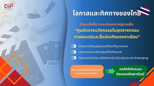 ​จากแนวโน้มการเติบโตของเทคโนโลยีในอุตสาหกรรมภาพยนตร์และสื่อบันเทิงข้างต้น สะท้อนให้เห็นว่า ตลาดยังคงเปิดกว้างสำหรับผู้เล่นรายใหม่และนักสร้างสรรค์อิสระ โดยประเทศที่ไม่ได้เป็นศูนย์กลางของอุตสาหกรรมก็สามารถเร่งพัฒนาเทคโนโลยีและก้าวเข้ามาแข่งขันในเวทีนี้ได้ หากได้รับการสนับสนุนด้านนโยบายและการลงทุนอย่างเหมาะสม สำหรับโอกาสและทิศทางของประเทศไทย แม้จำนวนสิทธิบัตรยังไม่สูงมากนัก แต่มีอัตราการเติบโตสูงต่อเนื่องในระยะ 10 ปีหลัง ประกอบกับคู่แข่งในอาเซียนมีจำกัด กรมฯ มองว่าเป็นโอกาสสำคัญของไทยที่จะยกระดับบทบาทสู่การเป็นศูนย์กลางนวัตกรรมของภูมิภาคนี้ เนื่องจากไทยมีจุดแข็งหลายด้าน ทั้งต้นทุนทางวัฒนธรรมและศิลปะที่หลากหลาย สามารถต่อยอดให้เข้ากับเทคโนโลยี Immersive Media เช่น AR/VR หรือ Avatar เพื่อสร้างประสบการณ์ใหม่ในสื่อบันเทิงและท่องเที่ยว อีกทั้งยังมีบุคลากรในสายสร้างสรรค์ที่มีศักยภาพ ไม่ว่าจะเป็นนักออกแบบ นักแสดง หรือนักพัฒนาเกม ที่สามารถสร้างคอนเทนต์และเทคโนโลยีได้เอง โดยศึกษาแนวทางพัฒนานวัตกรรมจากบริษัทชั้นนำของโลก หรือเชื่อมโยงความร่วมมือกับกลุ่มประเทศ Emerging เช่น อินเดีย สหรัฐอาหรับเอมิเรตส์ เพื่อสร้างตลาดร่วมในเทคโนโลยีที่มีศักยภาพ และใช้กลไกทรัพย์สินทางปัญญาเป็นฐานรองรับและนำไทยสู่สนามแข่งขันในเวทีสากล