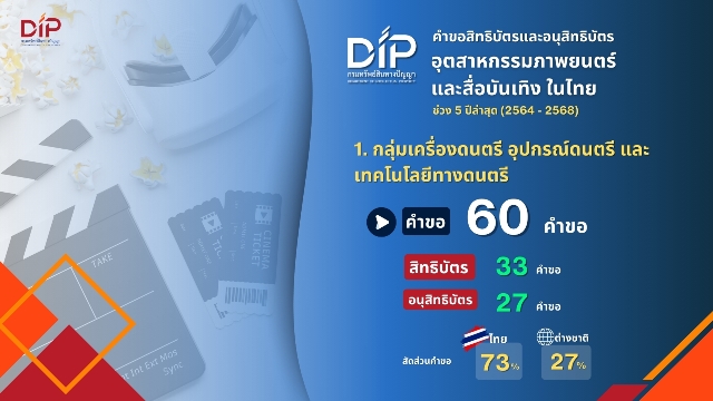 ​สำหรับสถิติคำขอสิทธิบัตรและอนุสิทธิบัตรกลุ่มอุตสาหกรรมภาพยนตร์และสื่อบันเทิงในไทย ในช่วง 5 ปีล่าสุด (2564 – 2568) พบว่า มีการขับเคลื่อนเทคโนโลยีโดยผสานความคิดสร้างสรรค์เข้ากับนวัตกรรมอย่างเป็นรูปธรรม โดยสามารถจำแนกนวัตกรรมออกเป็น 2 กลุ่มหลัก ได้แก่ 1) เครื่องดนตรี อุปกรณ์ดนตรี และเทคโนโลยีทางดนตรี รวม 60 คำขอ (สิทธิบัตร 33 คำขอ และอนุสิทธิบัตร 27 คำขอ) ที่น่าสนใจคือ คำขอส่วนใหญ่มาจากผู้ขอคนไทยถึง 44 คำขอ (คิดเป็น 73% ของคำขอทั้งหมดในกลุ่มนี้) สะท้อนศักยภาพและความตื่นตัวของนักประดิษฐ์ไทยในด้านนวัตกรรมดนตรี ทั้งการพัฒนาเครื่องดนตรีใหม่ อุปกรณ์เสริม หรือเทคโนโลยีที่ช่วยในการสร้างและควบคุมเสียง ทั้งนี้ เมื่อพิจารณาข้อมูลผู้ยื่นคำขอชาวไทย พบว่า เป็นบุคคลธรรมดาสูงถึง 73% รองลงมาคือสถาบันการศึกษา 25% และภาคเอกชน 2% ซึ่งสะท้อนว่า นวัตกรรมด้านดนตรีของไทยยังขับเคลื่อนโดยนักสร้างสรรค์อิสระและภาคการศึกษาเป็นหลัก ขณะที่ภาคธุรกิจยังมีบทบาทค่อนข้างน้อย ซึ่งอาจเป็นทั้ง “ช่องว่าง” และ “โอกาส” สำหรับการต่อยอดในอนาคต 2) การบันทึกและระบบประมวลผลเสียงมัลติมีเดีย รวม 63 คำขอ (สิทธิบัตร 60 คำขอ และอนุสิทธิบัตร 3 คำขอ) คำขอส่วนใหญ่ยื่นโดย บริษัท ดอลบี้ แล็บบอราทอรี่ส์ ไลเซนซิ่ง คอร์ปอเรชั่น (สหรัฐอเมริกา) สูงถึง 50 คำขอ ซึ่งบริษัทดังกล่าวเป็นเจ้าของนวัตกรรมเสียงรอบทิศทางและระบบประมวลผลเสียงที่ใช้กันอย่างแพร่หลายในอุตสาหกรรมภาพยนตร์ แพลตฟอร์มสตรีมมิ่ง และสื่อดิจิทัล สะท้อนให้เห็นว่าเทคโนโลยีการบันทึกและประมวลผลเสียงเป็นพื้นที่เชิงกลยุทธ์ที่บริษัทข้ามชาติมีการลงทุนด้านการวิจัยและคุ้มครองทรัพย์สินทางปัญญาอย่างเข้มข้น เพื่อรักษาความเป็นผู้นำทางเทคโนโลยีในตลาดโลก