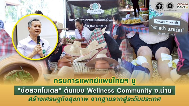 กรมการแพทย์แผนไทยและการแพทย์ทางเลือก เดินหน้าขับเคลื่อนยุทธศาสตร์ประเทศไทย สู่ศูนย์กลางสมุนไพรและสุขภาพโลก (World Herbal & Wellness Hub) ลงพื้นที่จังหวัดน่าน เปิดเกณฑ์มาตรฐาน “ชุมชนเวลเนส (Wellness Community)” ชู “บ่อสวก และ บ้านน้ำเกี๋ยน” เป็นโมเดลนิเวศสุขภาพ ที่สมบูรณ์แบบ ระดับประเทศ ผสานภูมิปัญญาท้องถิ่นเข้ากับนวัตกรรม สร้างรายได้และการท่องเที่ยวที่ยั่งยืนยกระดับสมุนไพรพื้นบ้านสู่นวัตกรรมเชิงพาณิชย์