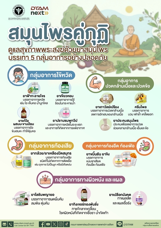 ด้าน นายแพทย์อำพล เวหะชาติ ผู้อำนวยการศูนย์การแพทย์แผนไทยและการแพทย์ทางเลือก เปิดเผยว่า สำหรับยาสมุนไพรที่ควรนำมาใช้ดูแลพระสงฆ์ใน 5 กลุ่มอาการที่พบบ่อย ดังนี้ 1.กลุ่มอาการไข้หวัด ได้แก่ ยาฟ้าทะลายโจร สรรพคุณ บรรเทาอาการหวัด เช่น ไอ เจ็บคอ น้ำมูกไหล ยาปราบชมพูทวีป บรรเทาอาการหวัด ในระยะแรก และอาการที่เกิดจากการแพ้อากาศ ยาแก้ไอผสมมะขามป้อม สรรพคุณ บรรเทาอาการไอ ขับเสมหะ ทำให้ชุ่มคอ ยาเขียวหอม สรรพคุณ บรรเทาอาการไข้ ร้อนในกระหายน้ำ 2.กลุ่มอาการปวดกล้ามเนื้อและปวดข้อ ได้แก่ ยาเถาวัลย์เปรียง สรรพคุณ บรรเทาอาการปวดกล้ามเนื้อ ลดการอักเสบของกล้ามเนื้อ ยาประคบสมุนไพร สรรพคุณ ประคบเพื่อลดอาการปวด ช่วยคลายกล้ามเนื้อ เอ็นและข้อ ครีมไพล สรรพคุณ บรรเทาอาการบวม ฟกช้ำ เคล็ดยอก 3.กลุ่มอาการท้องเสีย (ไม่ติดเชื้อ) ได้แก่ ยากล้วย ยาเหลืองปิดสมุทร สรรพคุณ บรรเทาอาการท้องเสียชนิดที่ไม่เกิดจากการติดเชื้อ เช่น อุจจาระไม่เป็นมูก หรือมีเลือดปน 4.กลุ่มอาการท้องอืด ท้องเฟ้อ ได้แก่ ยาขมิ้นชัน สรรพคุณ บรรเทาอาการแน่นจุกเสียด ท้องอืด ท้องเฟ้อ ยาขิง สรรพคุณ บรรเทาอาการท้องอืด ขับลม แน่นจุกเสียด 5.กลุ่มอาการทางผิวหนัง และแผล ได้แก่ ยาทิงเจอร์ทองพันชั่ง สรรพคุณ ทาแก้กลากเกลื้อน โรคผิวหนังที่เกิดจาก เชื้อรา น้ำกัดเท้า ยาโลชันพญายอ สรรพคุณ บรรเทาอาการผดผื่นคัน ลมพิษ ตุ่มคัน ยาเปลือกมังคุด สรรพคุณ ทาแผลสดและแผลเรื้อรัง เป็นต้น