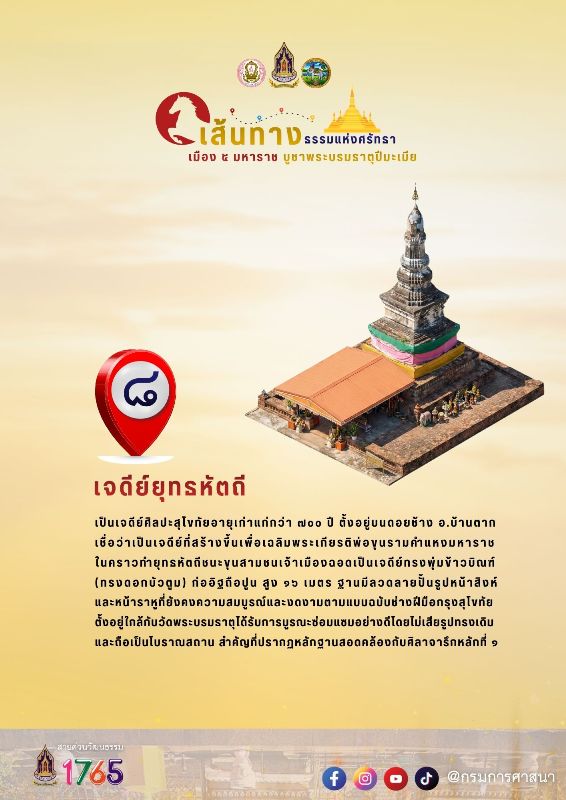 อธิบดีกรมการศาสนา กล่าวต่อไปว่า เส้นทางธรรมแห่งศรัทธาในครั้งนี้มุ่งเน้นการเชื่อมโยงแหล่งมรดกทางวัฒนธรรมที่สะท้อนถึงพระมหากรุณาธิคุณของมหาราชทั้ง 5 พระองค์ และความเชื่อเรื่องพระธาตุประจำปีเกิด โดยมีไฮไลต์สำคัญ 8 จุดเช็คอินที่ไม่ควรพลาด ได้แก่ (1) วัดพระนารายณ์ วัดสมัยกรุงศรีอยุธยา ที่สมเด็จพระนารายณ์มหาราชทรงโปรดให้สร้างขึ้นเพื่อเฉลิมพระเกียรติเมื่อครั้งเสด็จไปตีเมืองเชียงใหม่และได้รับชัยชนะ (2) วัดดอยข่อยเขาแก้ว หรือวัดเสี่ยงทายบารมีพระเจ้าตาก มีเจดีย์บรรจุอังคารบิดาและมารดาของสมเด็จพระเจ้าตากสินมหาราชซึ่งได้รับการขึ้นทะเบียนเป็นโบราณสถาน (3) ตรอกบ้านจีน เป็นตำนานย่านการค้าที่สำคัญแห่งหนึ่งที่ยังเหลือร่องรอยของสถาปัตยกรรมที่ควรคู่กับการอนุรักษ์ไว้ (4) พิพิธภัณฑ์เมืองเฉลิมพระเกียรติ จังหวัดตาก สร้างขึ้นเนื่องในโอกาสมหามงคลเฉลิมพระชนมพรรษา 80 พรรษา โดยปรับปรุงจากอาคารจวนผู้ว่าราชการจังหวัดตาก (หลังเก่า) เนื่องจากเคยเป็น “เรือนประทับ” ของพระบาทสมเด็จพระบรมชนกาธิเบศร มหาภูมิพลอดุลยเดชมหาราช บรมนาถบพิตร และสมเด็จพระนางเจ้าสิริกิติ์ พระบรมราชินีนาถ พระบรมราชชนนีพันปีหลวง เมื่อครั้งเสด็จเมืองตาก เมื่อปี พ.ศ. 2501 (5) ศาลสมเด็จพระเจ้าตากสินมหาราช เป็นศาลที่สร้างขึ้นเป็นแห่งแรกของเมืองไทย (6) อุโมงค์เนินธรรมสุทธิ (Unseen ไท ไทย) โบราณสถานที่สร้างขึ้นในสมัยครูบาสุยะต๋า เพื่อการเข้าปริวาสกรรม (7) วัดพระบรมธาตุ พระธาตุประจำปีเกิดคนเกิดปีมะเมีย เป็นพระเจดีย์ที่สร้างเลียนแบบเจดีย์ชเวดากอง ภายในประดิษฐานหลวงพ่อทันใจ สันนิษฐานว่าสร้างขึ้นในสมัยสุโขทัย และ (8) เจดีย์ยุทธหัตถี เป็นโบราณสถานที่สร้างขึ้นเพื่อเฉลิมพระเกียรติพ่อขุนรามคำแหงมหาราชในการชนช้างชนะขุนสามชน เจ้าเมืองฉอด