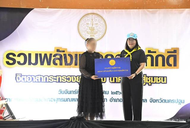 ต่อจากนั้น ปลัดกระทรวงยุติธรรม ได้มอบเงินเยียวยาแก่ผู้เสียหายในคดีอาญาที่ผ่านการพิจารณาจากคณะอนุกรรมการพิจารณาค่าตอบแทนผู้เสียหาย และค่าทดแทนและค่าใช้จ่ายแก่จำเลยในคดีอาญาประจำจังหวัดนครปฐม จำนวน 4 ราย และมอบความช่วยเหลือจากกองทุนยุติธรรม ที่ได้รับการพิจารณาจากคณะอนุกรรมการให้ความช่วยเหลือประจำจังหวัดนครปฐม จำนวน 2 ราย พร้อมทั้งได้เยี่ยมชมบูธนิทรรศการการนำเสนอภารกิจ/ผลงานสำคัญและงานบริการด้านกระบวนการยุติธรรมของหน่วยงานในสังกัดกระทรวงยุติธรรม จำนวน 12 หน่วยงาน