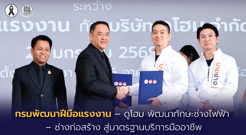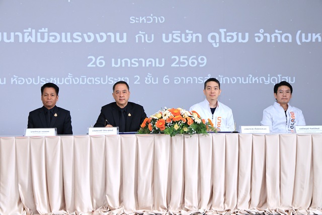วันที่ 26 มกราคม 2569 กรมพัฒนาฝีมือแรงงาน และ บริษัท ดูโฮม จำกัด (มหาชน) ลงนามบันทึกความเข้าใจความร่วมมือการพัฒนาฝีมือแรงงานกลุ่มช่างไฟฟ้าและช่างก่อสร้าง โดยนายสมาสภ์ ปัทมะสุคนธ์ อธิบดีกรมพัฒนาฝีมือแรงงาน และนายมารวย ตั้งมิตรประชา กรรมการบริหารบริษัท ดูโฮม จำกัด (มหาชน) เป็นผู้ลงนาม นายภัทรวุธ เภอแสละ รองอธิบดีกรมพัฒนาฝีมือแรงงาน และนายไพทูรย์ กังสวิวัฒน์ ผู้อำนวยการสายงานธุรกิจบริหารงานติดตั้งและโฮมเซอร์วิส บริษัท ดูโฮม จำกัด (มหาชน) เป็นพยาน นอกจากนี้ยังมีผู้บริหารกรมพัฒนาฝีมือแรงงาน และบริษัท ดูโฮม จำกัด (มหาชน) ร่วมงาน ณ ห้องประชุมตั้งมิตรประชา 3 บริษัท ดูโฮม จำกัด (มหาชน) (สำนักงานใหญ่) ตำบลบางพูน อำเภอเมืองปทุมธานี จังหวัดปทุมธานี