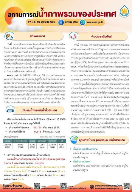 สรุปสถานการณ์น้ำภาพรวมของประเทศ วันที่ 27 ม.ค. 69 เวลา 7.00 น.
