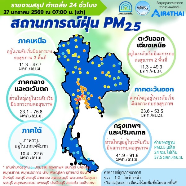 ศูนย์สื่อสารการแก้ไขปัญหามลพิษทางอากาศ (ศกพ.) กรมควบคุมมลพิษ รายงานการติดตามตรวจสอบคุณภาพอากาศ ประจำวันที่ 27 มกราคม 2569 ณ 07:00 น. ภาพรวมปริมาณ PM2.5 ในประเทศพบเกินค่ามาตรฐาน 26 จังหวัด ได้แก่ ปทุมธานี กรุงเทพฯ นนทบุรี นครปฐม สมุทรสาคร สมุทรปราการ น่าน พิษณุโลก อุทัยธานี ชัยนาท สิงห์บุรี ลพบุรี สระบุรี อ่างทอง สุพรรณบุรี พระนครศรีอยุธยา ราชบุรี สมุทรสงคราม เพชรบุรี ปราจีนบุรี สระแก้ว ฉะเชิงเทรา ชลบุรี ระยอง หนองคาย และ ขอนแก่น