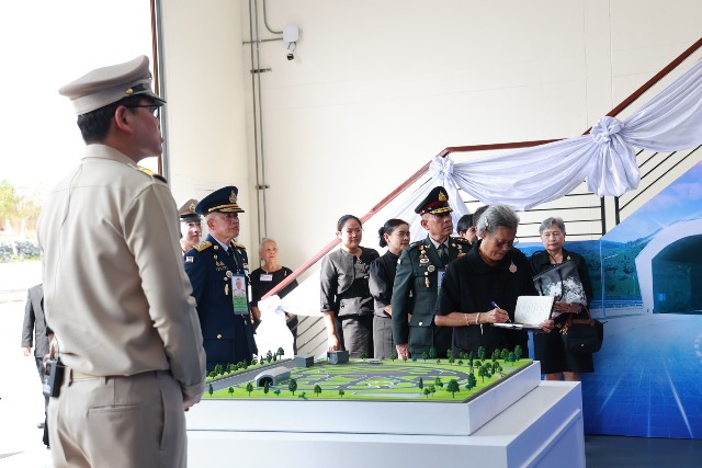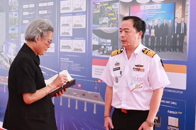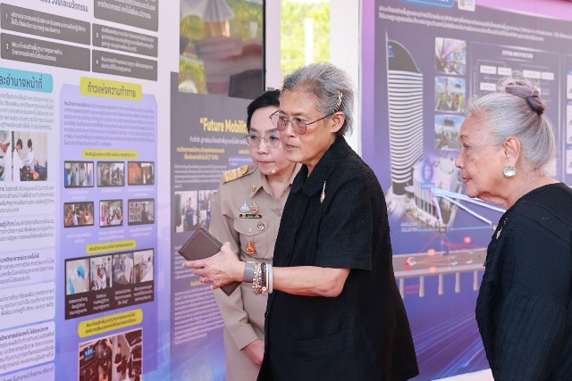 จากนั้น สมเด็จพระกนิษฐาธิราชเจ้า กรมสมเด็จพระเทพรัตนราชสุดาฯ สยามบรมราชกุมารี เสด็จพระราชดำเนินไปยังจุดแสดงนิทรรศการ ทรงทอดพระเนตรนิทรรศการภาพรวมของกรมวิทยาศาสตร์บริการ โดย ดร.พจมาน ท่าจีน รองอธิบดี รักษาราชการแทนอธิบดีกรมวิทยาศาสตร์บริการ ได้กราบบังคมทูลถวายรายงานผลการดำเนินงานโครงการฯ ซึ่งมีเป้าหมายเพื่อจัดตั้งสนามทดสอบยานยนต์อัตโนมัติที่เป็นโครงสร้างพื้นฐานสำคัญด้านคุณภาพ (National Quality Infrastructure: NQI) รองรับการพัฒนา การทดสอบ และการประเมินความปลอดภัยของยานยนต์แห่งอนาคต เพื่อยกระดับอุตสาหกรรมยานยนต์ของประเทศให้เป็นที่ยอมรับในระดับสากล พร้อมด้วยนิทรรศการของหน่วยงานร่วม ได้แก่ การทางพิเศษแห่งประเทศไทย จุฬาลงกรณ์มหาวิทยาลัย มหาวิทยาลัยเทคโนโลยีพระจอมเกล้าธนบุรี สำนักงานพัฒนาวิทยาศาสตร์และเทคโนโลยีแห่งชาติ หลังจากเสด็จออกจากบริเวณจัดนิทรรศ สมเด็จพระกนิษฐาธิราชเจ้า กรมสมเด็จพระเทพรัตนราชสุดาฯ สยามบรมราชกุมารี ทรงทอดพระเนตรการเพื่อการสาธิตสมรรถนะยานยนต์ขับขี่อัตโนมัติ และระบบระบุตำแหน่งด้วยเลเซอร์ ก่อนเสด็จไปยังพลับพลาพิธี เพื่อทรงฉายพระฉายาลักษณ์ร่วมกับผู้บริหารกระทรวง อว. ผู้บริหารและเจ้าหน้าที่กรมวิทยาศาสตร์บริการ พร้อมทรงลงพระนามาภิไธยในแผ่นศิลา และเสด็จออกจากพลับพลาพิธี ประทับรถยนต์พระที่นั่งเพื่อเสด็จไปยังเรือนรับรองที่ประทับวิทยพิมาน อำเภอวังจันทร์ จังหวัดระยอง