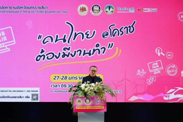 ทั้งนี้ ขอเชิญชวนคนหางาน นักเรียน นักศึกษา และประชาชนที่สนใจหางาน ต้องการพัฒนาทักษะฝีมือ และหาไอเดียในการประกอบอาชีพเสริม มาพบกันในงาน “คนไทยต้องมีงานทำ @ โคราช” ระหว่างวันที่ 27-28 มกราคม 2569 ตั้งแต่เวลา 10.00 น. – 16.30 น. ณ เทอร์มินอลฮอลล์ ชั้น 4 ศูนย์การค้าเทอร์มินอล 21 โคราช โดยสามารถลงทะเบียนสมัครงานเพื่อความสะดวกได้ที่เว็บไซต์กรมการจัดหางาน e-Service.doe.go.th “ไทยมีงานทำ” หากต้องการสอบถามข้อมูลเพิ่มเติมติดต่อได้ที่ สำนักงานจัดหางานจังหวัดนครราชสีมา โทร 044 355265-7