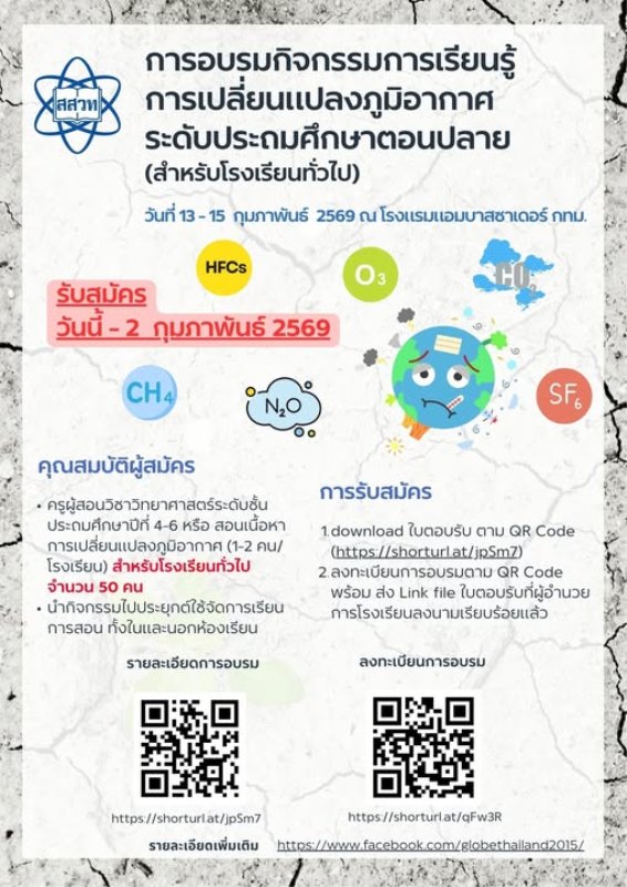 สถาบันส่งเสริมการสอนวิทยาศาสตร์และเทคโนโลยี (สสวท.) เปิดรับสมัครครูระดับประถมศึกษาตอนปลาย เข้ารับการอบรม “กิจกรรมการเรียนรู้การเปลี่ยนแปลงภูมิอากาศ ระดับประถมศึกษาตอนปลาย (สำหรับโรงเรียนทั่วไป)” ระหว่างวันที่ 13–15 กุมภาพันธ์ 2569 ณ โรงแรมแอมบาสซาเดอร์ สุขุมวิท กรุงเทพฯ เพื่อเสริมสร้างความรู้ ความเข้าใจ และแนวทางการจัดการเรียนรู้ด้านการเปลี่ยนแปลงภูมิอากาศที่สามารถนำไปประยุกต์ใช้ได้จริงทั้งในและนอกห้องเรียน เตรียมพร้อมรับมือวิกฤตโลกร้อน โดย สสวท. สนับสนุนค่าอาหารกลางวัน อาหารว่าง เอกสารประกอบการอบรม และค่าที่พัก คุณสมบัติผู้สมัครเป็นครูผู้สอนวิชาวิทยาศาสตร์ ป.4–6 หรือสอนเนื้อหาการเปลี่ยนแปลงภูมิอากาศ โรงเรียนละ 1–2 คน สมัครได้ตั้งแต่วันนี้ถึง 2 กุมภาพันธ์ 2569 รับจำนวนจำกัด ผู้สนใจสามารถดาวน์โหลดเอกสารและดูรายละเอียดการสมัครได้ที่ https://globethailand.ipst.ac.th/news.php
