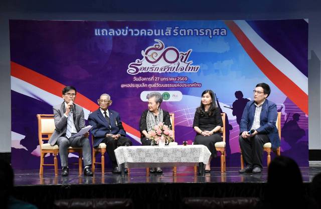 วันอังคารที่ 27 มกราคม 2569 เวลา 10.30 น. พลโท นายแพทย์ ธำรงรัตน์ แก้วกาญจน์ รองประธานมูลนิธิสายใจไทย ในพระบรมราชูปถัมภ์ และที่ปรึกษาการจัดคอนเสิร์ตการกุศล “50 ปี ร้อยรัก สายใจไทย” พร้อมด้วย ดร. สง่า ดามาพงษ์ ประธานจัดงานคอนเสิร์ตฯ นางอติพร สุนทรสนาน เสนะวงศ์ กรรมการและเลขาธิการมูลนิธิสุนทราภรณ์ ในพระราชูปถัมภ์สมเด็จพระเทพรัตนราชสุดา ฯ สยามบรมราชกุมารี นางยุถิกา อิศรางกูร ณ อยุธยา อธิบดีกรมส่งเสริมวัฒนธรรม และนายปรัสถา สิโรรส นายกสมาคมนิสิตเก่าอุตสาหกรรมเกษตร มหาวิทยาลัยเกษตรศาสตร์ ร่วมแถลงข่าวการจัดคอนเสิร์ตการกุศล “50 ปี ร้อยรักสายใจไทย” โดยมีนางณัฐภา จีรพรบัณฑิต ผู้อำนวยการศูนย์วัฒนธรรมแห่งประเทศไทย แขกผู้มีเกียรติ ศิลปิน และสื่อมวลชน เข้าร่วม ณ หอประชุมเล็ก ศูนย์วัฒนธรรมแห่งประเทศไทย