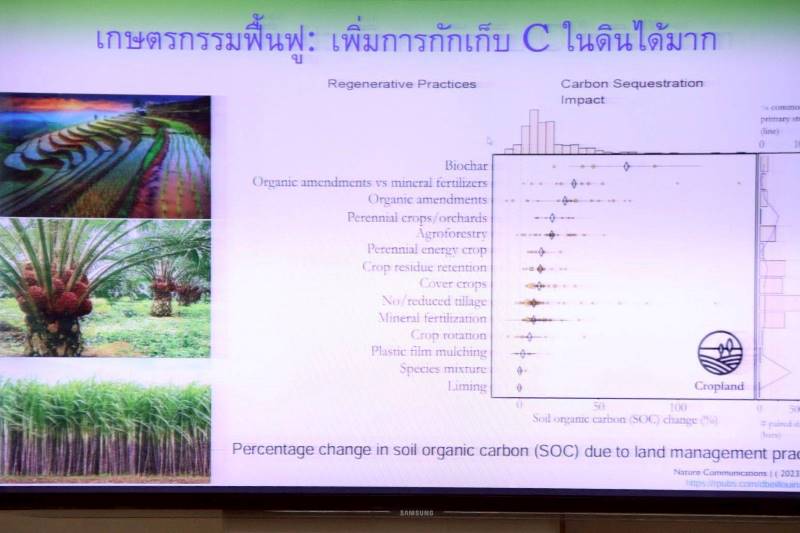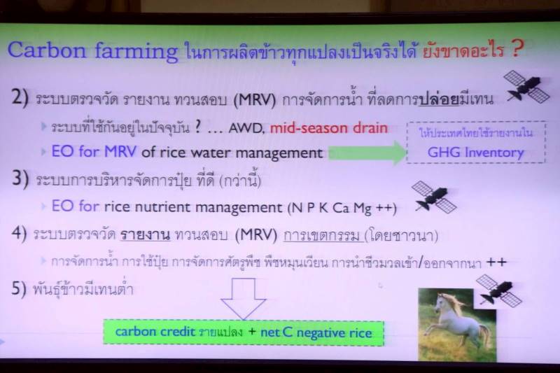 “กรมการข้าวได้มีการเตรียมนำ EO Platform หรือระบบคลาวด์ขนาดใหญ่ที่ออกแบบมาเพื่อเข้าถึง จัดการ และประมวลผลข้อมูลโดยนำเทคโนโลยีสังเกตโลกมาใช้ ผ่านความร่วมมือกับสำนักงานพัฒนาเทคโนโลยีอวกาศและภูมิสารสนเทศ (GISTDA) ที่จะช่วยในการติดตาม ตรวจวัด รายงาน และทวนสอบการจัดการน้ำในนาข้าว ภายใต้แนวคิด AWD และ Mid-season Drainage ควบคู่กับการพัฒนานวัตกรรมจาก Harvard Innovation Lab เพื่อเพิ่มความแม่นยำและความน่าเชื่อถือของข้อมูล และที่สำคัญการพัฒนาพันธุ์ข้าวที่ปลดปล่อยก๊าซมีเทนต่ำ รวมถึงการส่งเสริมเกษตรกรรมเชิงฟื้นฟู (Regenerative Agriculture) เป็นอีกกลไกสำคัญที่ช่วยเพิ่มการกักเก็บคาร์บอนในดิน ลดการปล่อยก๊าซเรือนกระจก และยกระดับการผลิตข้าวไทยสู่ ข้าวคาร์บอนต่ำ ซึ่งสอดคล้องกับเป้าหมายการพัฒนาที่ยั่งยืน (SDGs) และการเตรียมความพร้อมรับมือกับกติกาการค้าระหว่างประเทศที่ให้ความสำคัญกับประเด็นสิ่งแวดล้อมมากยิ่งขึ้น ตามแนวนโยบายการดำเนินงานของกรมการข้าวในเรื่องของ การผลิตข้าวคาร์บอนต่ำและเกษตรแม่นยำ” อธิบดีกรมการข้าว กล่าว