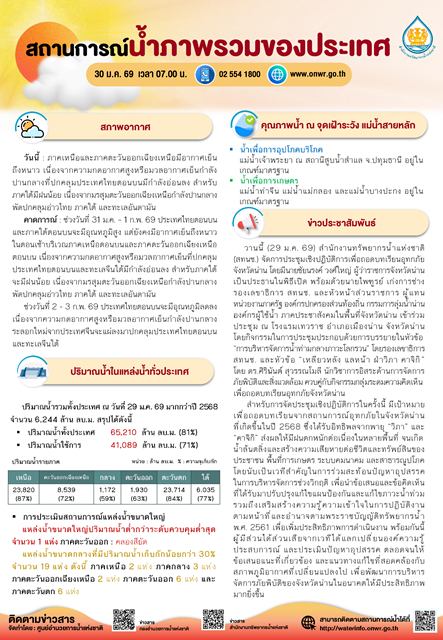 สรุปสถานการณ์น้ำภาพรวมของประเทศ วันที่ 30 ม.ค. 69 เวลา 7.00 น.