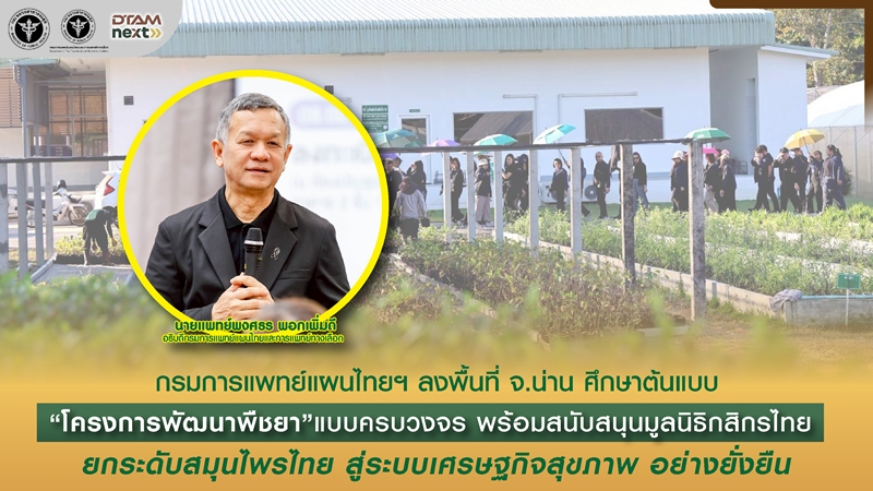 กรมการแพทย์แผนไทยและการแพทย์ทางเลือก ลงพื้นที่จังหวัดน่าน ศึกษาดูงานโครงการพัฒนาพืชยา แบบครบวงจร ซึ่งดำเนินการโดยสถาบัน KAG Innovate ภายใต้มูลนิธิกสิกรไทย ร่วมกับมูลนิธิประชากรไทย และมหาวิทยาลัยเทคโนโลยีราชมงคลล้านนาน่าน (มทร.ล้านนาน่าน) เพื่อแลกเปลี่ยนองค์ความรู้และวางแนวทางความร่วมมือในการยกระดับสมุนไพรไทยสู่ระบบเศรษฐกิจสุขภาพในระยะยาว
