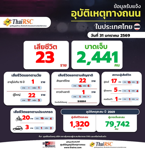 สถานการณ์อุบัติเหตุทางถนนในประเทศไทย รายสัปดาห์ 25-31 ม.ค. 69 1 กุมภาพันธ์ 2026Thailandplusประชาสัมพันธ์ Facebook iconFacebookTwitter iconTwitterLINE iconLineสถานการณ์อุบัติเหตุทางถนนในประเทศไทย วันที่ 31 ม.ค. 69