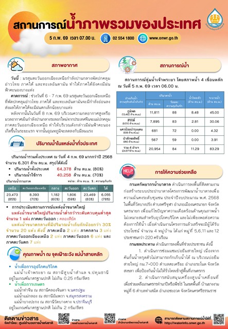 2. สถานการณ์น้ำอ่างเก็บน้ำในภาพรวม : ปริมาณน้ำรวม 80% ของความจุเก็บกัก (64,378 ล้าน ลบ.ม.) ปริมาณน้ำใช้การ 70% (40,258 ล้าน ลบ.ม.)