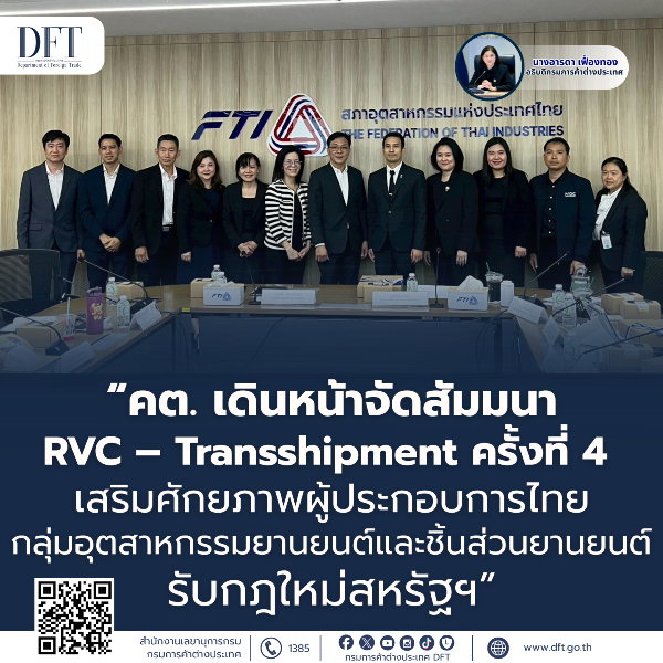 กรมการค้าต่างประเทศ (คต.) กระทรวงพาณิชย์ เดินหน้าสร้างความพร้อมให้ผู้ประกอบการไทยอย่างต่อเนื่อง โดยการจัดสัมมนาเชิงวิชาการ “RVC – Transshipment: การเตรียมความพร้อมผู้ประกอบการยานยนต์และชิ้นส่วนยานยนต์ตามหลักเกณฑ์ใหม่ของสหรัฐฯ” ครั้งที่ 4 ร่วมกับสมาคมอุตสาหกรรมยานยนต์ไทย เมื่อวันที่ 29 มกราคม 2569 ณ สภาอุตสาหกรรมแห่งประเทศไทย และผ่านระบบออนไลน์ MS Teams ซึ่งถือเป็นการต่อยอดจากการสัมมนาครั้งที่ 1 ครั้งที่ 2 และครั้งที่ 3 โดยจัดร่วมกับสภาผู้ส่งสินค้าทางเรือแห่งประเทศไทย (สรท.) สมาพันธ์เอสเอ็มอีไทยและสำนักงานส่งเสริมวิสาหกิจขนาดกลางและขนาดย่อม (สสว.) เพื่อให้ความรู้เชิงลึกเฉพาะผู้ประกอบการกลุ่มอุตสาหกรรมยานยนต์และชิ้นส่วนยานยนต์อย่างทั่วถึง ซึ่งเป็นอุตสาหกรรมสำคัญที่มีมูลค่าการส่งออกสูงไปยังตลาดสหรัฐฯ
